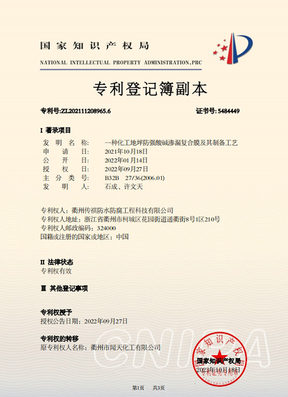 衢州傳祺新材料科技有限公司是衢州市聞天化工有限公司的下屬企業(yè);衢州市聞天化工有限公司成立于2003年,是國內最早研發(fā)、生產氟碳涂料的企業(yè)之一。衢州傳祺新材料科技有限公司成立于2017年,公司專注于高分子氟材料的開發(fā)和含氟材料在防腐、防水領域的應用。經過6年的不懈努力,已獲得了化工和建筑領域六項國家發(fā)明專利授權和兩項新產品科技成果獎,參與了中國建筑材料流通協(xié)會《房屋修繕防水工程規(guī)范》標準的編制工作,中建協(xié)涂裝委員會浙西工作站設立在我公司。